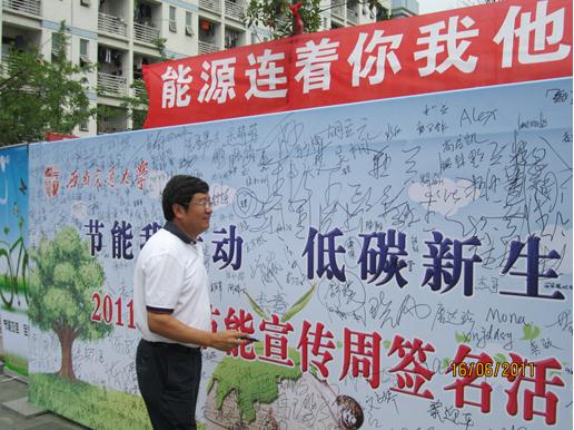 此次活动的开展旨在通过广泛、深入的节水、节能宣传,唤起大家的“节约”意识和“环保”意识,活动更以“节水节能、人人参与”的呼吁声唤来了师生员工们踊跃参与,数千人在“西南交通大学全国城市节水、节能宣传周签名活动”的签名墙上落下了自己名字,借以表达自己对节能减排的坚定信念。