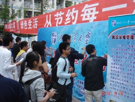新闻背景:今年年初,成都市委、市政府提出了建设“世界现代田园城市”的战略部署和长远目标,水资源能否被合理利用受到了社会的广泛关注。在2010年5月全国城市节水宣传周期间,以“贯彻落实节水条例,共建生态田园城市”为主题的城市节水宣传活动在全市范围内全面铺开,西南交大积极响应号召,围绕今年城市节水宣传周的主题掀起了宣传活动的新浪潮。