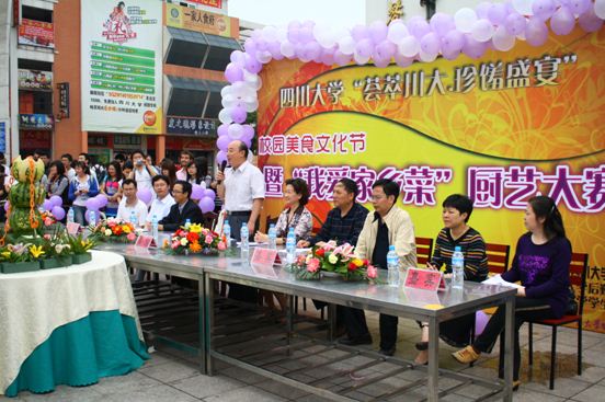 5月27日上午10点,四川大学“荟萃川大,珍馐盛宴”校园美食文化节暨第四届大学生“我爱家乡菜”厨艺大赛决赛在校青春广场隆重举行。此次大赛由后勤集团主办,校团委、后勤集团饮食中心与校学生会承办。副校长安小予教授,后勤集团党委书记郭小利,四川大学江安校区管委会副主任曲景学,四川大学学工部副部长潘霜柏,校团委徐海鑫老师及饮食中心相关负责人等参加了本次大赛。大赛邀请到了原成都市饮食技术学校校长、国家级烹饪大师曾庭孝担任主评,饮食中心管理人员及学生代表担任评委。